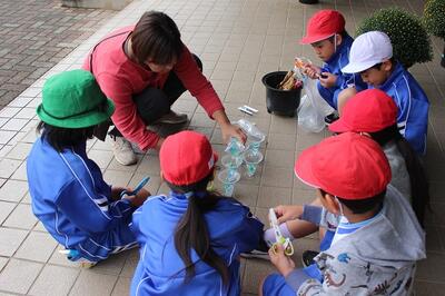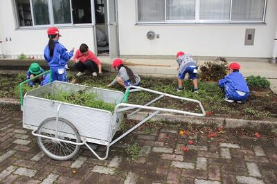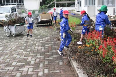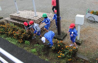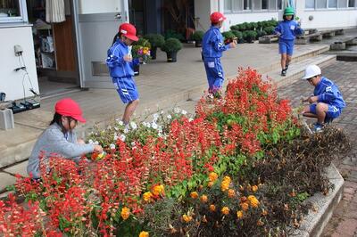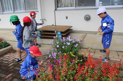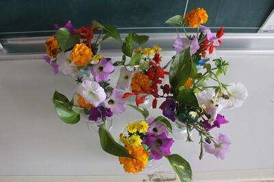 夏の間、きれいな花を咲かせてみんなを和ませてくれたマリーゴールドやサルビア。今月末には、新しい花の苗にバトンタッチします。今日は、1・2年生が、最後の花を摘んできれいに飾りました。