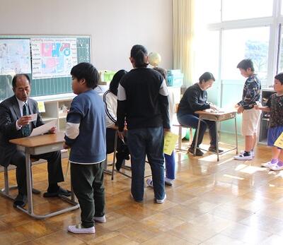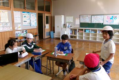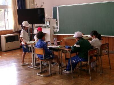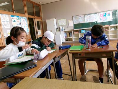 休み時間の学習室です。1~3年生が遠足の相談をしています。3年生がリーダーとなって話合いをしっかりと進めています。💮