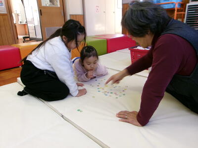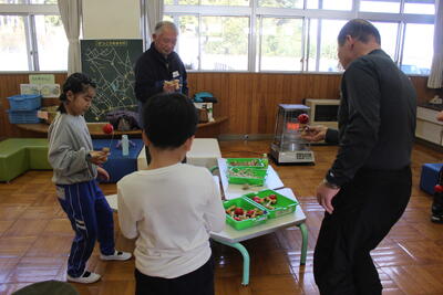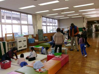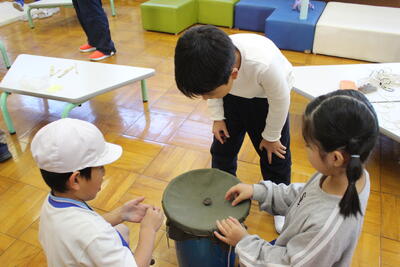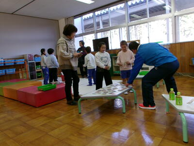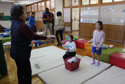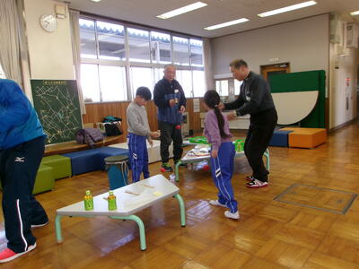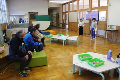 1・2年生が、地域の学習支援ボランティアの皆さんをお迎えして「昔の遊び」体験をしました。