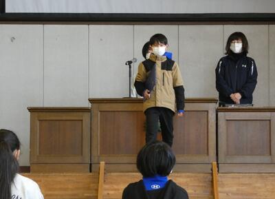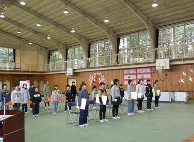 練習の後、各種表彰を行いました。一人一人が、理科研究、書道、柔道など素晴らしい活躍をしています。