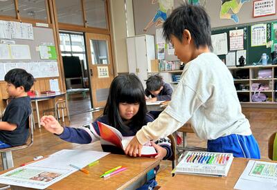 複式での授業ですが、子供たち一人一人がめあてをもって真剣に学んでいます。