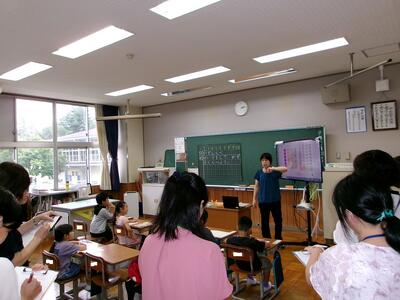 14名の参観者に囲まれ、1年生5人の姿が見えませんが、子供たちはいつもどおり、落ち着いて学習に取り組みました。