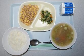 4月27日の給食 投稿: 管理者 (12:31) ごはん、牛乳、二色丼の具(肉そぼろ、炒り卵)、ほうれん草のごまあえ、かみなり汁 ※かみなり汁は、雷の多い栃木県ならではの郷土料理です。豆腐をごま油で炒めるときに、バリバリと雷のような音がすることからその名がつきました。 -