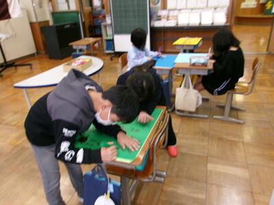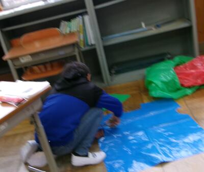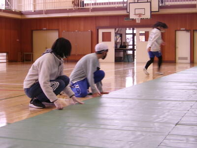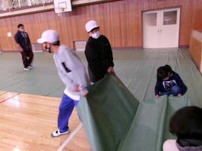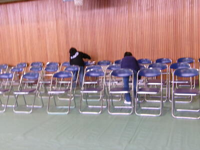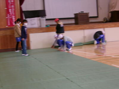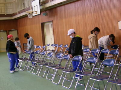 今週土曜日は、校内マラソン大会・学習発表会です。今日は、昼休みを使って、5・6年生が体育館のシート敷きや椅子の確認をしました。