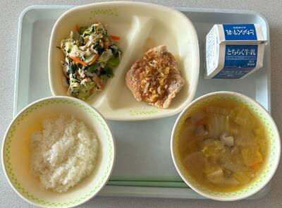 1月30日(金) 投稿: 管理者 (12:22) 🍚ご飯 牛乳 モロのねぎソースかけ ゆばとかんぴょうのサラダ うどのみそ汁 😋今日の給食は「与一くんランチ」です。米、牛乳、ゆば、かんぴょう、うど、にんじん、しいたけ、大根、ねぎなど県産や市産の食材をたくさん使っています。サラダは食物繊維たっぷりの「かんぴょう」と大豆の旨みがぎゅっとつまった「ゆば」を使いました。みそ汁は、シャキシャキとしたうどの食感が楽しい香り豊かなみそ汁です。地元の新鮮な食材を味わってみましょう。 -