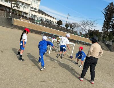 1・2年生、体育の授業です。半袖・ハーフパンツで元気いっぱい!