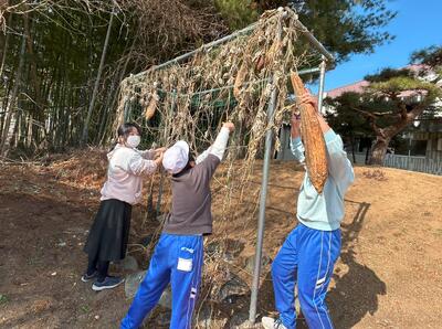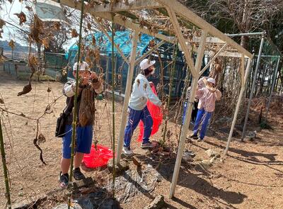 4年生は理科です。大きく育ったヘチマの収穫作業中。