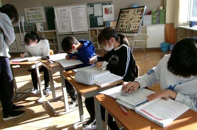 6年生は算数です。小学校の学習のまとめ問題に取り組んでいます。