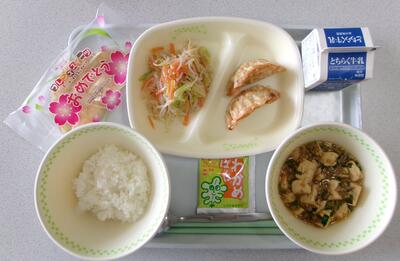 3月23日(月) 投稿: 管理者 (12:09) 🍚ご飯 牛乳 県産豚肉にら入り餃子 ふりかけ 春雨サラダ マーボー豆腐 フレープ 💐今日は、令和7年度最後の給食です。この1年間、給食の時間は皆さんにとってどのような時間だったでしょうか。新しい味に出会ったり、苦手な食べ物に挑戦してみたりと、いろいろな成長があったと思います。来年度も毎日の給食を楽しみながら、元気いっぱいの学校生活を送ってくださいね。 -