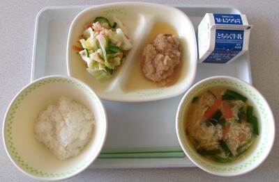 🍚ご飯 牛乳 ハンバーグのおろしソースかけ フレンチサラダ かきたまみそ汁