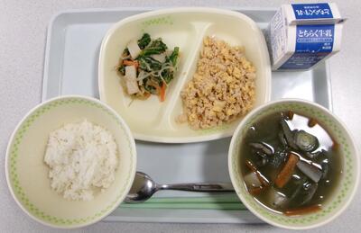 🍚麦ご飯 牛乳 二色丼の具(肉そぼろ・炒り卵) 春菊のごま和え スキー汁