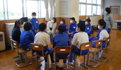 5・6年生は、輪になって「Who am I ?」を行いました。